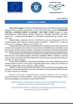 UAT Comuna Agigea, contract de finanțare pentru proiectul ORGANIZARE FESTIVAL „DARURILE MĂRII LA AGIGEA”