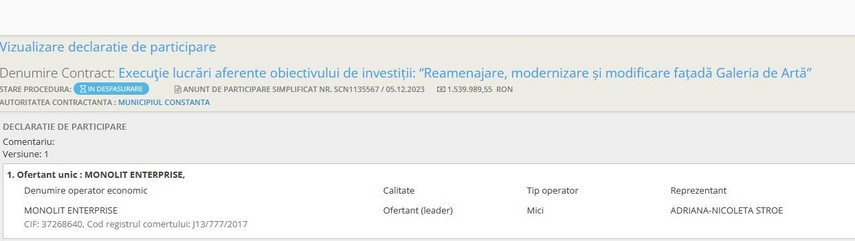 - Monolit Enterprise din Constanța este singurul ofertant înscris în licitație