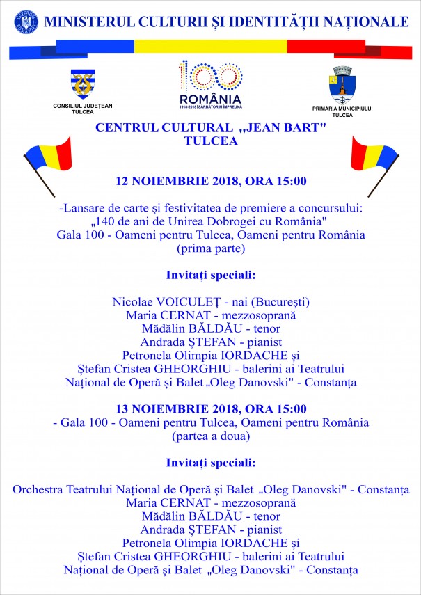 Consiliul Județean Tulcea implementează proiectul „Gala 100 – Oameni pentru Tulcea, Oameni pentru România“, care se va derula la Teatrul Jean Bart în zilele de 12 și 13 noiembrie 2018, cu începere de la ora 15.00, finanțarea fiind asigurată de Ministerul Culturii și Identității Naționale.