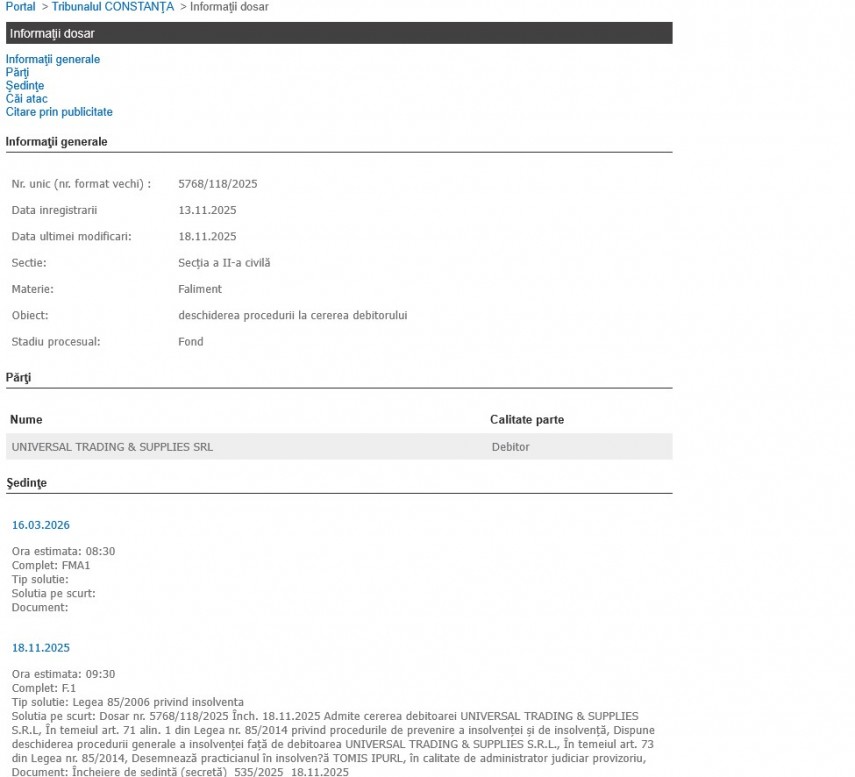 Este oficial! Universal Trading & Supplies SRL a intrat în insolvență, după sentința nr. 535/18.11.2025 a Tribunalului Constanța.
