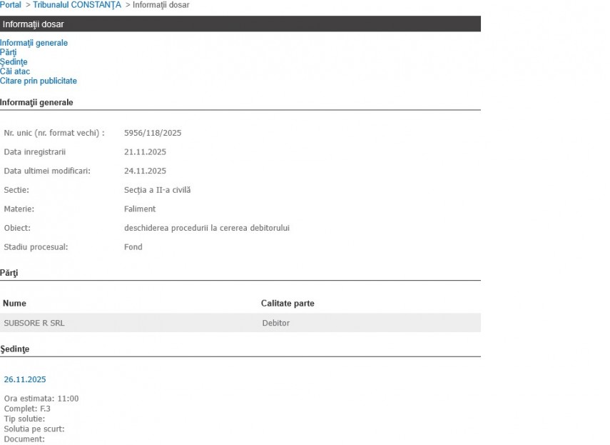 Pe 21 noiembrie 2025, la Tribunalul Constanța a fost înregistrat dosarul 5956/118/2025, în care Subsore R SRL își cere insolvența.