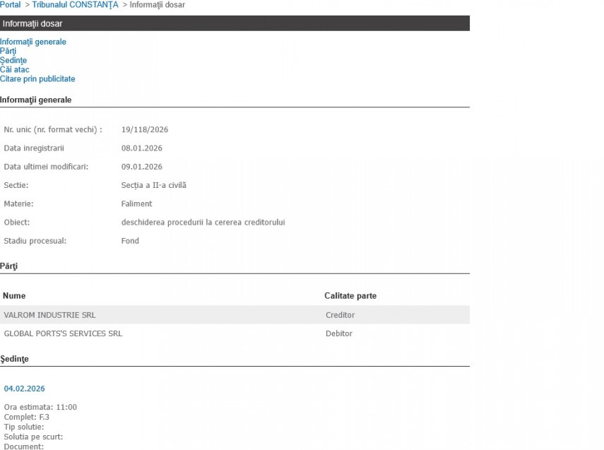 La Tribunalul Constanța Valrom Industrie SRL cere insolvența Global Ports's Services SRL. Când a fost stabilit termenul de judecată