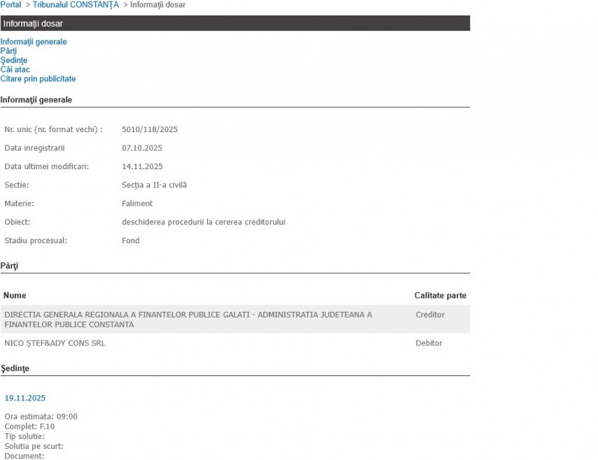 Astăzi, 19 noiembrie a.c., Tribunalul Constanța are pe rol dosarul de insolvență al societății Nico Ștef&Ady Cons SRL.