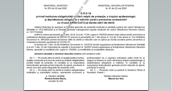 În Monitorul Oficial al României Partea I numărul 435, a fost publicat aproape de miezul nopții, și datat 22 mai 2020, Ordinul 874/22 privind instituirea obligativității purtării măștii de protecție, a triajului epidemiologic și dezinfectarea obligatorie a mâinilor pentru prevenirea contaminării cu virusul SARS-CoV-2 pe durata stării de alertă.