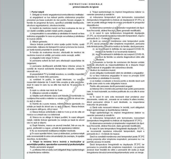 Astfel, pe durata stării de alertă se instituie obligativitatea instituțiilor și autorităților publice, operatorilor economici și profesioniștilor de a organiza activitatea astfel încât să se asigure la intrarea în sediu efectuarea triajului epidemiologic și dezinfectarea obligatorie a mâinilor în condițiile și cu respectarea Instrucțiunilor generale privind măsurile de igienă.