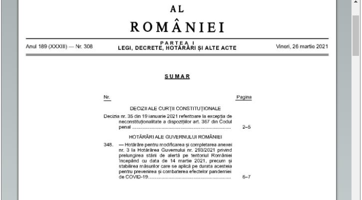 - În această seară, în Monitorul Oficial al României Partea I numărul 308 a fost publicată Hotărârea pentru modificarea şi completarea anexei nr. 3 la Hotărârea Guvernului nr. 293/2021 privind prelungirea stării de alertă pe teritoriul României începând cu data de 14 martie 2021, precum şi stabilirea măsurilor care se aplică pe durata acesteia pentru prevenirea şi combaterea efectelor pandemiei de COVID-19.