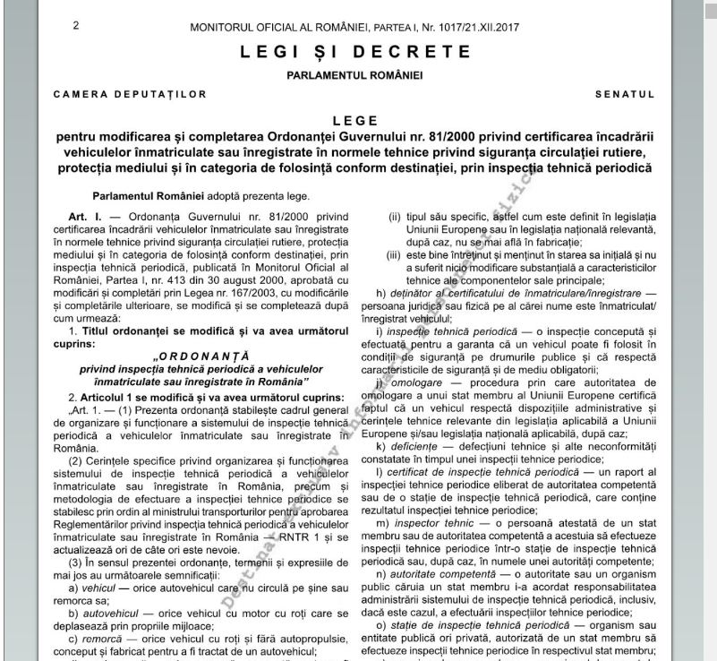 Este vorba despre Legea 260 care a fost publicată în Monitorul Oficial al României partea I numărul 1017/21 decembrie 2017, care modifică și completează Ordonanța Guvernului nr. 81/2000 privind certificarea încadrării vehiculelor înmatriculate sau înregistrate în normele tehnice privind siguranța circulației rutiere, protecția mediului și în categoria de folosință conform destinației, prin inspecția tehnică periodică