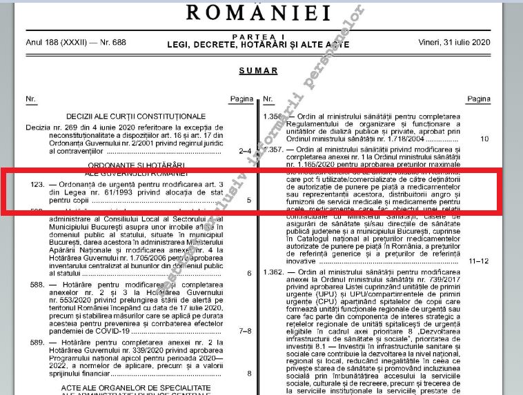 În această noapte, în Monitorul Oficial nr. 688 din 31 iulie a fost publicată Ordonanță de urgență numărul 123 pentru modificarea art. 3 din Legea nr. 61/1993 privind alocația de stat pentru copii.