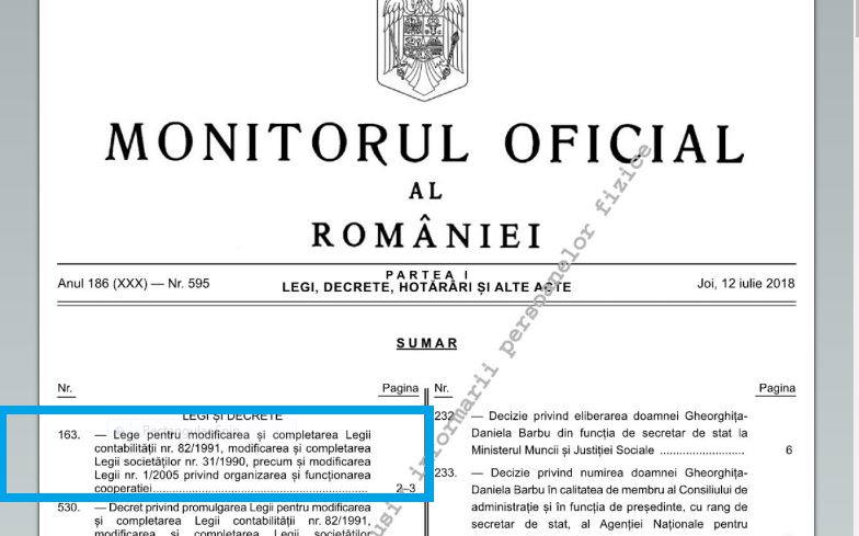 Legea nr. 163/2018 pentru modificarea și completarea Legii contabilității nr. 82/1991, modificarea și completarea Legii societăților nr. 31/1990, precum și modificarea Legii nr. 1/2005 privind organizarea și funcționarea cooperației
