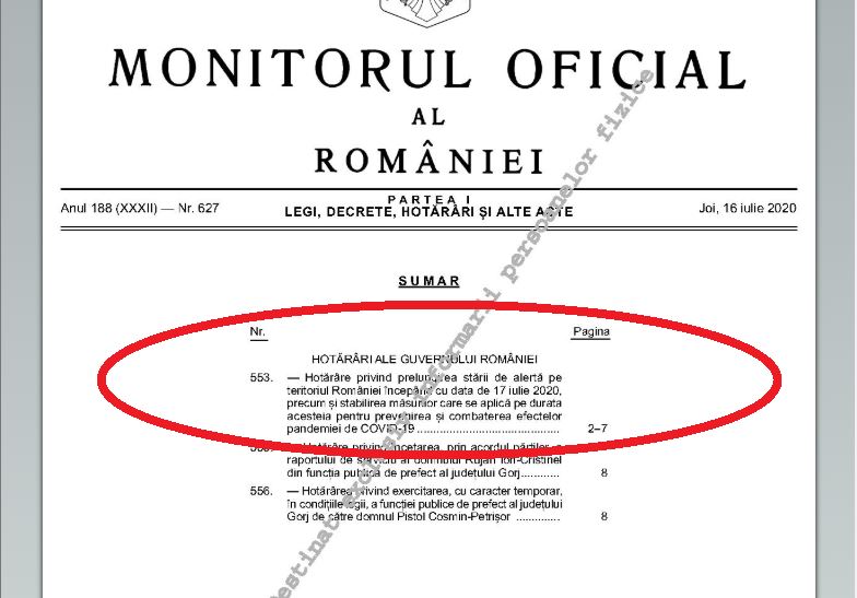 În această noapte a fost publicată, în Monitorul Oficial al României Partea I numărul 627 din 16 iulie, Hotărârea de Guvern numărul 553 privind prelungirea stării de alertă pe teritoriul României şi măsurile care se aplică pe durata acesteia pentru prevenirea şi combaterea efectelor pandemiei de COVID-19.