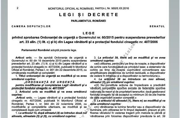 Legea nr. 242/2016 privind aprobarea Ordonanţei de urgenţă a Guvernului nr. 60/2015 pentru suspendarea prevederilor art. 23 alin. (1) lit. c) şi k) din Legea vânătorii şi a protecţiei fondului cinegetic nr. 407/2006 a fost publicată în Monitorul oficial al României numărul 988/8.XII.2016.