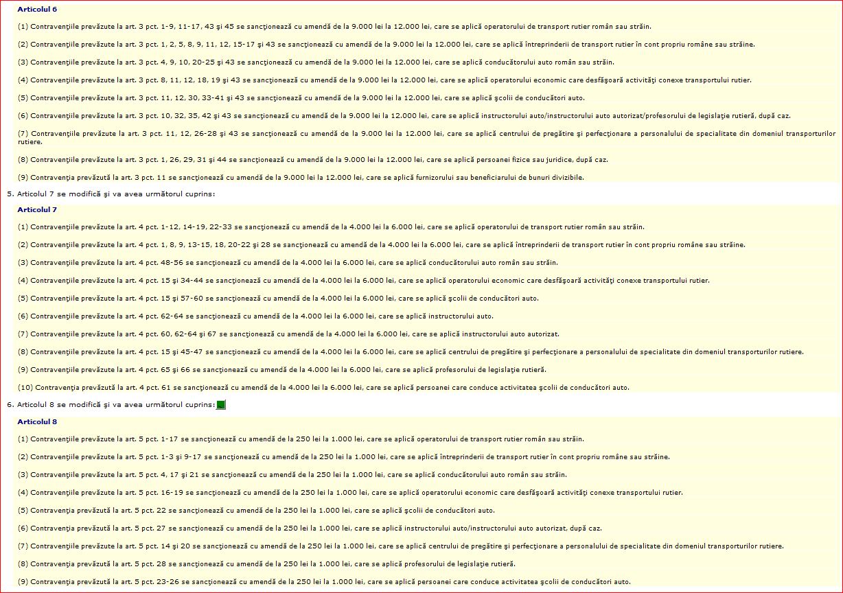 Dintre acestea, amintim Articolul 3, privind fapte ce reprezintă încălcări foarte grave ale prevederilor Regulamentului (CE) nr. 1.071/2009, ale Regulamentului (CE) nr. 1.072/2009, ale Regulamentului (CE) nr. 1.073/2009, ale Ordonanței Guvernului nr. 27/2011, cu modificările și completările ulterioare, și ale normelor de aplicare a acesteia, și constituie contravenții, dacă acestea nu au fost săvârșite în astfel de condiții încât, potrivit legii penale, să constituie infracțiuni.
