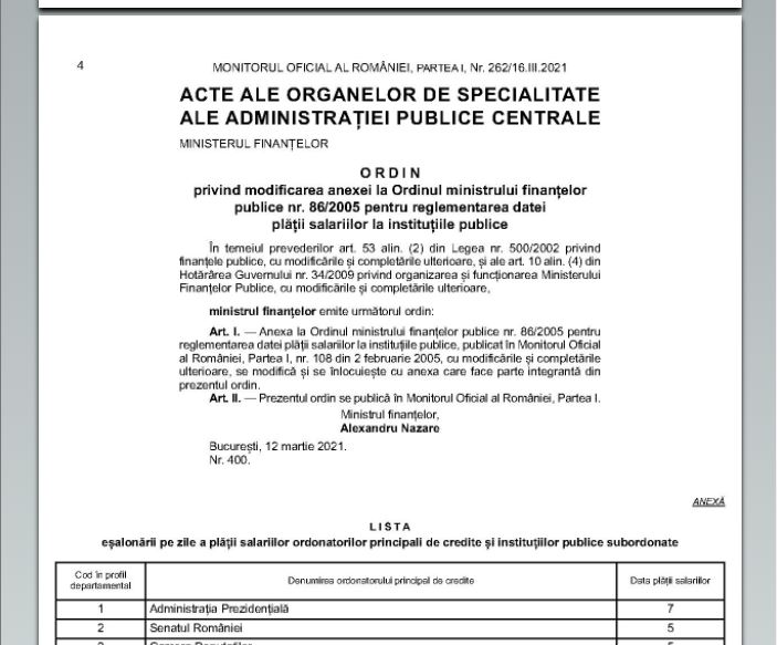 - În Monitorul Oficial al României Partea I numărul 262 din 16 martie a fost publicat Ordinul Ministerul Finanțelor nr. 400/2021 privind modificarea anexei la Ordinul ministrului finanțelor publice nr. 86/2005 pentru reglementarea datei plății salariilor la instituțiile publice.