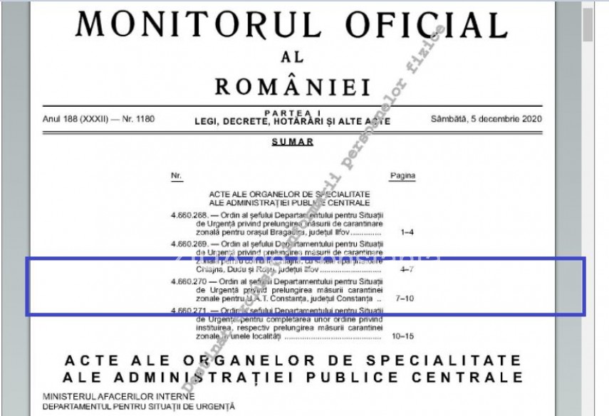 În Monitorul Oficial al României Partea I numărul 1180, din 5 decembrie, a fost publicat Ordinul Departamentului pentru Situații de Urgență, numărul 4.660.269 din 4 decembrie, privind prelungirea măsurii carantinei zonale pentru UAT Constanța-județul Constanța.