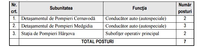 Inspectoratul pentru Situaţii de Urgenţă „Dobrogea” al judeţului Constanţa, cu sediul în municipiul Constanţa, str. Mircea cel Bătrân nr.110, organizează concurs/examen în vederea ocupării unor posturi vacante de execuţie, în condiţiile prevăzute de art. 6, alin. 1, lit. f din Ordinul M.I.R.A. nr. 665/2008 privind unele activităţi de management resurse umane în unităţile M.I.R.A., cu modificările şi completările ulterioare şi a reglementărilor legale de nivel superior şi interne incidente, cu recrutare din sursă externă, a tuturor persoanelor care corespund cerințelor postului, condițiilor legale și criteriilor specifice enunțate în prezentul anunț. Posturile vacante de execuţie pentru care se organizează concurs/examen, în condiţiile mai sus menţionate sunt următoarele:Pe scurt, Inspectoratul pentru Situaţii de Urgenţă „Dobrogea” al judeţului Constanţa scoate la concurs, cu recrutare din sursă externă un număr de 34 posturi vacante, necesare asigurarii intervenţiei în situaţii de urgenţă, astfel: