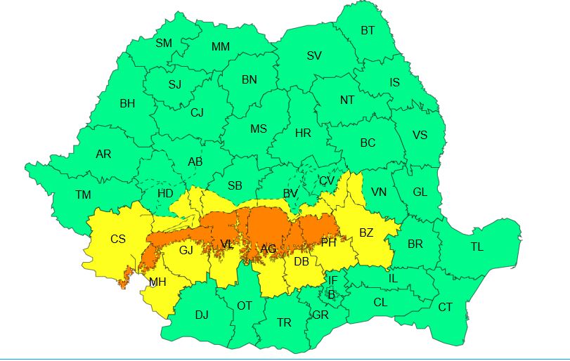 A fost emis și un COD GALBEN, valabil în intervalul 26 ianuarie, ora 10:00 – 27 ianuarie, ora 20:00.În intervalul menționat, în zona deluroasă și montană a județelor Mehedinți, Gorj, Vâlcea, Argeș, Dâmbovița și Prahova, vor fi precipitații sub formă de ploaie și lapoviță, importante cantitativ, ce vor favoriza topirea stratului de zăpadă. Se vor acumula cantități de apă de 60...80 l/mp. La altitudini de peste 1700 m, vor predomina ninsorile și se va depune strat de zăpadă de 30...40 cm, iar vântul va prezenta intensificări, astăzi și la noapte, cu rafale de peste 100 km/h, viscolind ninsoarea și determinând reducerea vizibilității sub 50 m- anunță meteorologii.