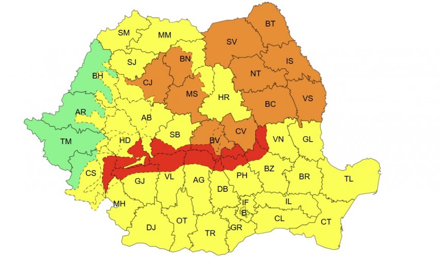 Totodată, s-a emis un cod portocaliu de vreme severă în perioada 28 decembrie 2025, ora 10.00 - 29 decembrie 2025, ora 02.00.