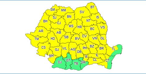 Administrația Națională de Meteorologie a emis cod galben în mai multe judeţe din România, valabil în perioada 19 iunie, ora 10 – 20 iunie, ora 23.Instabilitatea atmosferică va fi temporar accentuată în cea mai mare parte a țării. Vor fi perioade în care se vor semnala averse ce vor avea și caracter torențial, frecvente descărcări electrice, intensificări ale vântului, vijelii și căderi de grindină. În intervale scurte de timp sau prin acumulare, cantitățile de apă vor depăși 15...25 l/mp, iar pe arii restrânse 35...40 l/mp.