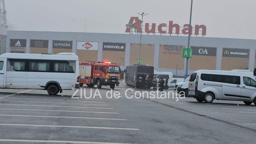 UPDATE. FOTO+VIDEO Incendiu la un autocar în parcarea Vivo Mall din Constanța! Intervin pompierii ISU Dobrogea