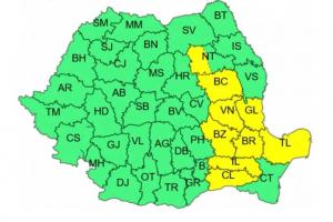 Un al doilea Cod Galben este valabil, până vineri, pentru mai multe regiuni geografice ale țării când, îndeosebi, în regiunile estice și sud-estice, la deal și la munte, mai ales după-amiaza și seara, instabilitatea atmosferică se va accentua și se vor semnala averse torențiale, frecvente descărcări electrice, intensificări de scurtă durată ale vântului, vijelii și căderi de grindină.