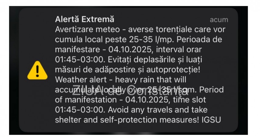 Conform mesajului transmis de IGSU, a fost emisă o avertizare meteo de averse torențiale care urmau să acumuleze local peste 25-35 de litri pe metru pătrat.