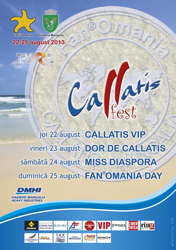 Primăria Mangalia, împreună cu Fanomania Holding și Asociația Callatis Fest-Marea Neagră, organizează, în perioada 22-25 august, în Portul Turistic Mangalia, o nouă ediție a Festivalului Callatis. Cele patru seri ale evenimentului vor fi structurate astfel: Seara I – Gala Premiilor VIP; Seara II – Dor de Callatis; Seara III – Miss Diaspora; Seara IV – Fanomania. Pe scena plutitoare din Portul turistic vor evolua artiști consacrați atât din domeniul muzical, dar nu numai. Printre numele care vor urca pe scena Festivalului Callatis, în serile I, III şi IV, se vor regăsi Compact și Felicia Filip, Timpuri Noi, Mihai Mărginean, Nicole Cherry, Julia și Romeo Saleno, Gheorghe Gheorghiu, DJ Ryno și Silvia, Ovidiu Komornic și mulți alții. La secțiunea dedicată muzicii populare (seara II), spectatorii prezenți vor putea asculta melodii ale unor interpreți celebri, printre care Maria Dragomiroiu, Aneta Stan, Valeria Arnăutu, precum și ansambluri de dansuri din România, Bulgaria și Republica Moldova. Ca și anul trecut, finanțarea Festivalului Callatis se va realiza fără implicarea bugetului local.21 august 2013 Biroul de presă