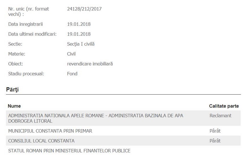 Iniţial, dosarul a fost înregistrat la Judecătoria Constanţa, instanţă care, pe 15 decembrie 2017, prin hotărârea 14090/2017, a declinat cauza Tribunalului, după ce a admis excepţia necompetenţei materiale a Judecătoriei Constanţa, invocată din oficiu.
