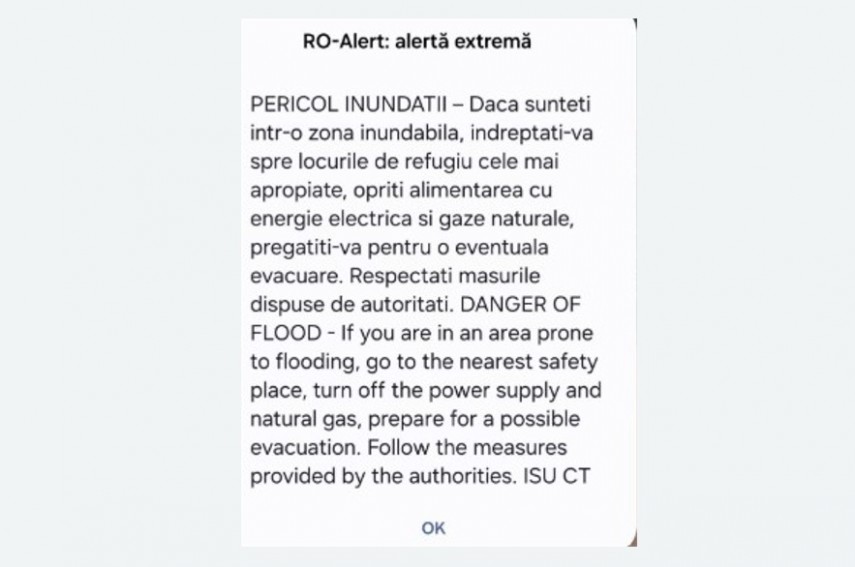 Populația din Mihail Kogălniceanu, Vulturul, Saraiu, Grădina din județul Constanța a primit un mesaj de avertizare prin sistemul RO-Alert, semnalând pericolul extrem de inundații.
