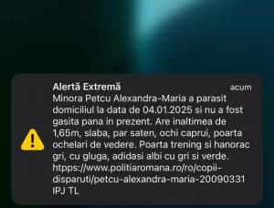 La data de 5 octombrie 2024, polițiștii din cadrul Inspectoratului de Poliție Județean Tulcea au fost sesizați cu privire la faptul că, numita PURCARU DENISA- GEORGIANA de 16 ani a părăsit în mod voluntar Unitatea de tip Familial de pe strada Păcii, unde era instituționalizată și nu a mai revenit până în prezent.Potrivit IPJ Tulcea, fata are următoarele semnalmente: 1,50 cm înălțime, ten măsliniu, păr brunet, ochi negri.