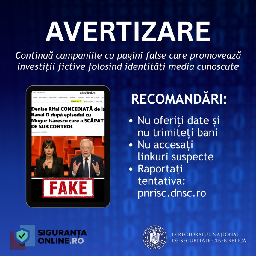 Directoratul Național de Securitate Cibernetică (DNSC) avertizează că în mediul online circulă tentative de fraudă care implică pagini web falsificate ce imită identitatea unor entități media cunoscute și promovează platforme fictive de investiții.