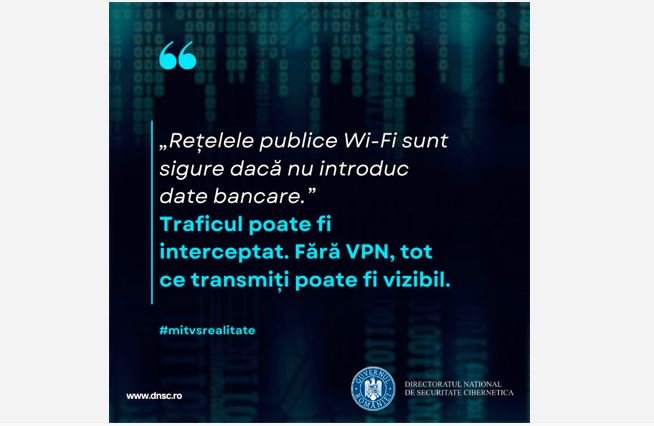 Directoratul Național de Securitate Cibernetică trage un semnal de alarmă asupra unui mit periculos care circulă în rândul utilizatorilor de internet: ideea că rețelele Wi-Fi publice sunt sigure atâta timp cât nu efectuăm tranzacții bancare.