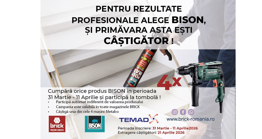 Constanța, 31 martie – Brick România dă startul unei campanii promoționale dedicate tuturor pasionaților de bricolaj și profesioniștilor din domeniu. În perioada 31 martie – 11 aprilie 2026, toți clienții care achiziționează produse BISON din magazinele Brick pot participa la tombola cu premii.
