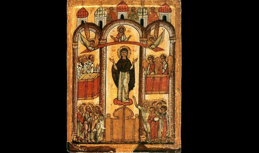 Trebuie să ştim că acest praznic a început a se prăznui pentru o pricină ca aceasta: în zilele împăratului Leon cel Înţelept în Constantinopol, spre o duminică, făcându-se priveghere de toată noaptea în sfânta biserică Vlaherna a Preasfintei Născătoarei de Dumnezeu, în întâia zi a lunii octombrie, şi mulţimea poporului stând înainte, ca la patru ceasuri de noapte fiind, Sfântul Andrei cel nebun pentru Hristos şi-a ridicat ochii în sus împreună cu ucenicul său, Fericitul Epifanie, şi au văzut pe Împărăteasa cerului, pe ocrotitoarea a toată lumea, pe Preasfânta Fecioară Născătoare de Dumnezeu, stând în văzduh şi rugându-se, strălucind cu lumină şi acoperind pe popor cu cinstitul său omofor, înconjurată de oşti cereşti şi de mulţime de sfinţi, care stăteau în haine albe cu cucernicie împrejurul ei; din care doi erau mai aleşi, Sfântul Ioan înaintemergătorul şi Evanghelistul Ioan. Iar cele cu umilinţă graiuri ale rugăciunii ei către iubitul său Fiu şi Dumnezeul nostru Iisus Hristos, acestea s-au auzit: "Împărate ceresc, primeşte pe tot omul cel ce Te slăveşte pe Tine, şi cheamă în tot locul preasfânt numele Tău; şi unde se face pomenirea numelui meu, acel loc îl sfinţeşte, şi preamăreşte pe cei ce Te preamăresc pe Tine, şi pe cei ce cu dragoste mă cinstesc pe mine Maica Ta. Primeşte-le toate rugăciunile şi făgăduinţele şi-i izbăveşte din toate nevoile şi răutăţile". ştiind şi noi pe solitoarea şi pe acoperitoarea noastră, să năzuim către dânsa cu umilinţă strigând: "Acoperă-ne pe noi cu acoperământul tău, Preasfânta Fecioară, în ziua răutăţilor noastre; acoperă-ne în toate zilele noastre, iar mai ales în ziua cea rea când sufletul de trup se va despărţi, de faţă să ne stai întru ajutor, şi să ne acoperi pe noi de duhurile cele rele din văzduh, cele de sub cer, şi în ziua înfricoşătoarei judecăţi, să ne acoperi pe noi întru ascunsul Acoperământului tău".