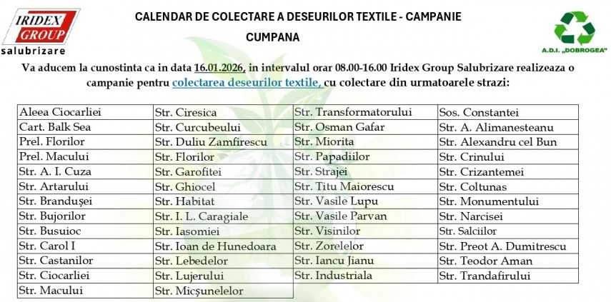 Campanie pentru colectarea deșeurilor textile în comuna Cumpăna, în zilele de 16,19 și 20 ianuarie 2026 (FOTO)