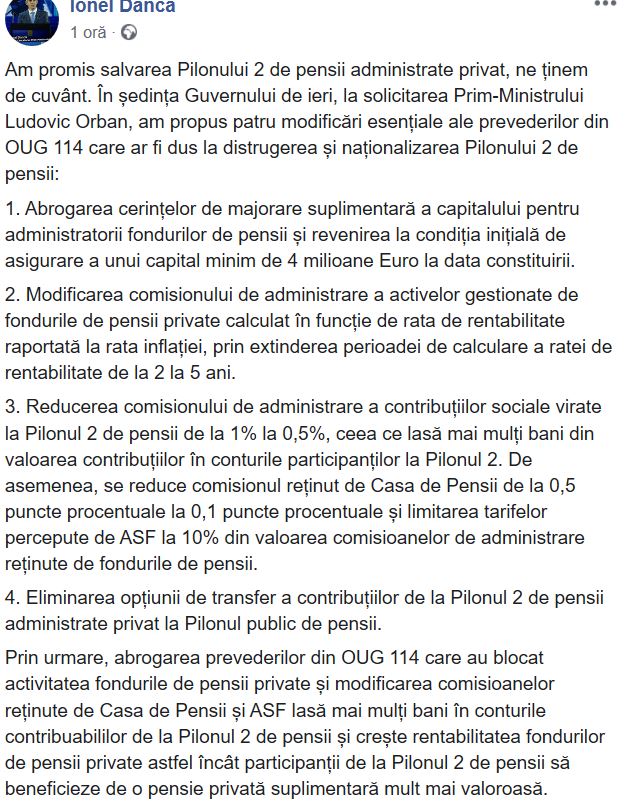 Prin urmare, abrogarea prevederilor din OUG 114 care au blocat activitatea fondurile de pensii private și modificarea comisioanelor reținute de Casa de Pensii și ASF lasă mai mulți bani în conturile contribuabililor de la Pilonul 2 de pensii și crește rentabilitatea fondurilor de pensii private astfel încât participanții de la Pilonul 2 de pensii să beneficieze de o pensie privată suplimentară mult mai valoroasă, “ a postat Ionel Dancă pe pagina sa de Facebook.