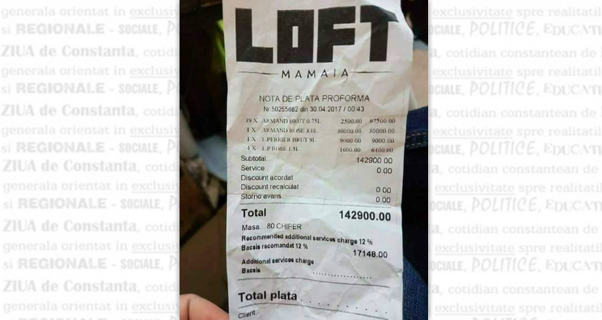 Un client extravagant a petrecut de pomină în clubul Loft din Staţiunea Mamaia în minivacanţa de 1 Mai. Nu s-a uitat la bani atunci când a comandat, astfel că la final nota de plată i-a lăsat pe mulţi cu gura căscată.Mai exact acesta a comandat 39 de sticle de şampanie, fiecare în valoare de 2500 de lei (în total 97.500 lei), o sticlă de Armand Rose (3 l) în valoare de 30.000 de lei, o sticlă de Perrier Brut (9 l) în valoare de 9.000 de lei și patru sticle de Perrier Rose (1,5 l) fiecare a câte 1600 de lei (în total 6.400 de lei). Valoarea totală a consumaţiei s-a ridicat la suma de 142.900 de lei.