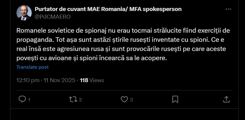 Romanele sovietice de spionaj nu erau tocmai strălucite fiind exerciții de propaganda. Tot așa sunt astăzi știrile rusești inventate cu spioni. Ce e real însă este agresiunea rusa și sunt provocările rusești pe care aceste povești cu avioane și spioni încearcă sa le acopere.- a transmis acesta pe pagina de X.