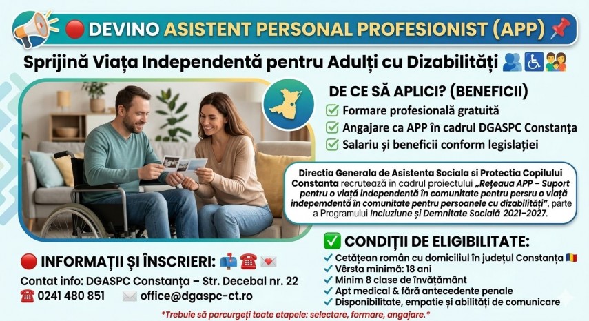 Direcția Generală de Asistență Socială și Protecția Copilului (DGASPC) Constanța recrutează persoane dedicate în cadrul proiectului „Rețeaua APP – Suport pentru o viață independentă în comunitate pentru persoanele cu dizabilități”, parte a Programului Incluziune și Demnitate Socială 2021–2027.