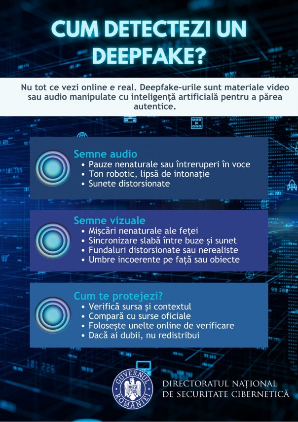 Directoratul Național de Securitate Cibernetică (DNSC) atrage atenția asupra informațiilor false care circulă în mediul online, acele „deepfake” - cum mai sunt cunoscute.