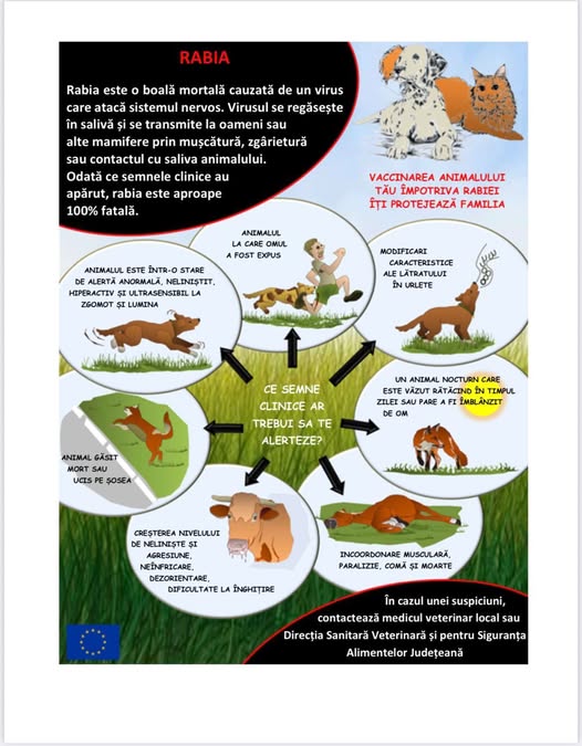 Datorită apariției unor focare de Rabie la animalele domestice și sălbatice pe teritoriul României, informăm populația asupra simptomelor acestei boli: