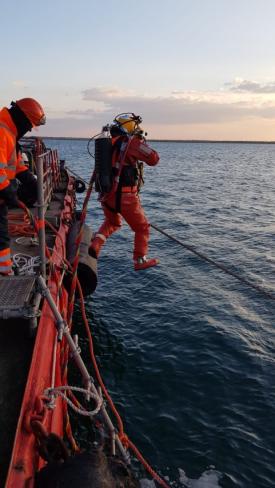 Scafandrii au reușit să amorseze și a doua pompă. Pe măsură ce nava se ușurează, macaraua și vinciurile recuperează din cabluri.