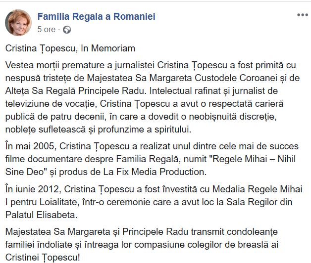 Majestatea Sa Margareta și Principele Radu transmit condoleanțe familiei îndoliate și întreaga lor compasiune colegilor de breaslă ai Cristinei Țopescu! “