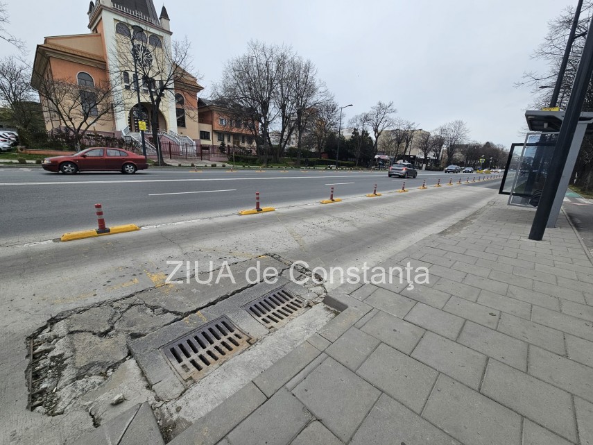 O groapă apărută în stația de autobuz 100, vis a vis de Catedrala Padre Pio din cartierul Tomis 3 din municipiul Constanța, ridică probleme de siguranță pentru pietoni.