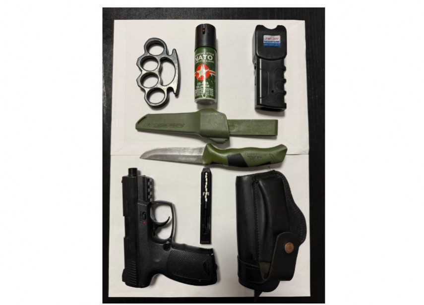 Forțele de ordine au procedat la interceptarea și legitimarea bărbatului, acesta prezentându-le jandarmilor mai multe obiecte pe care le avea asupra sa: un box, un spray cu substanță iritant-lacrimogenă, un dispozitiv cu electroșocuri, un cuțit cu lama de aproximativ 11 centimetri și lungimea totală de aproximativ 23 de centimetri și un pistol de tip airsoft, cu încărcător cu bile de plastic.