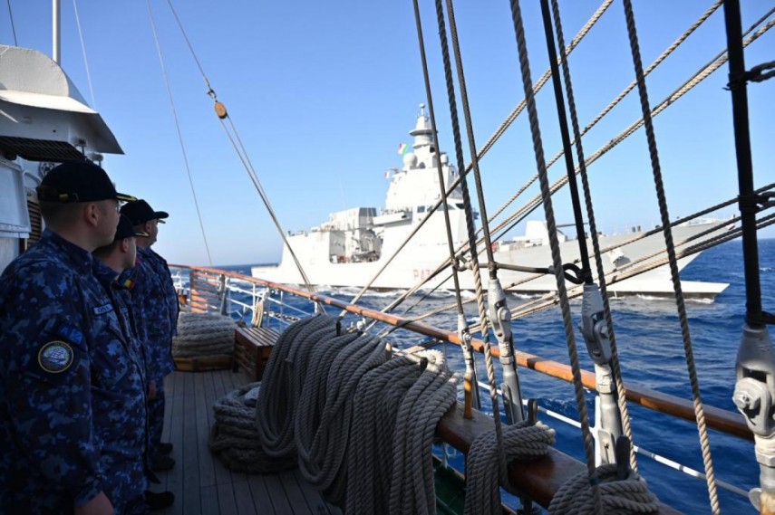 Un moment aparte al acestei etape de marș a fost interacțiunea pe mare, lângă coastele Siciliei, cu o navă a Marinei Militare Italiene, nava de patrulare Francesco Morosini, aflată în Operația EUNAVFOR MED IRINI sub egida Uniunii Europene. Manevrele de navigație executate de către cele două nave, dar mai ales manevrele de zbor ale elicopterului navei italiene au reprezentat o experiență inedită pentru echipajul velierului, în mod special pentru tinerii cadeți care au avut ocazia să experimenteze o mostră din ceea ce îi așteaptă în viitoarea carieră la bordul navelor militare.