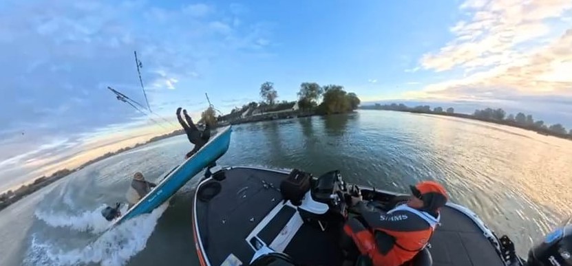 În imaginile surprinse se observă o ambarcațiune care stă pe apă, iar din depărtare se apropie cu viteză o barcă cu motor pe care se află doi bărbați.