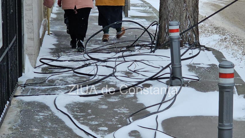 FOTO+VIDEO Pericol pentru pietoni pe strada Portiței din Constanța în urma unor cabluri căzute pe trotuar