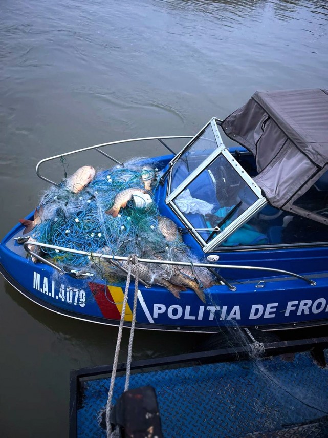 Garda de Coastă FOTO+VIDEO. Patru sturioni, 65 kg de pește capturat ilegal, peste 1.500 metri de plase și o barcă cu număr fals de identificare, descoperite de polițiștii de frontieră din Tulcea