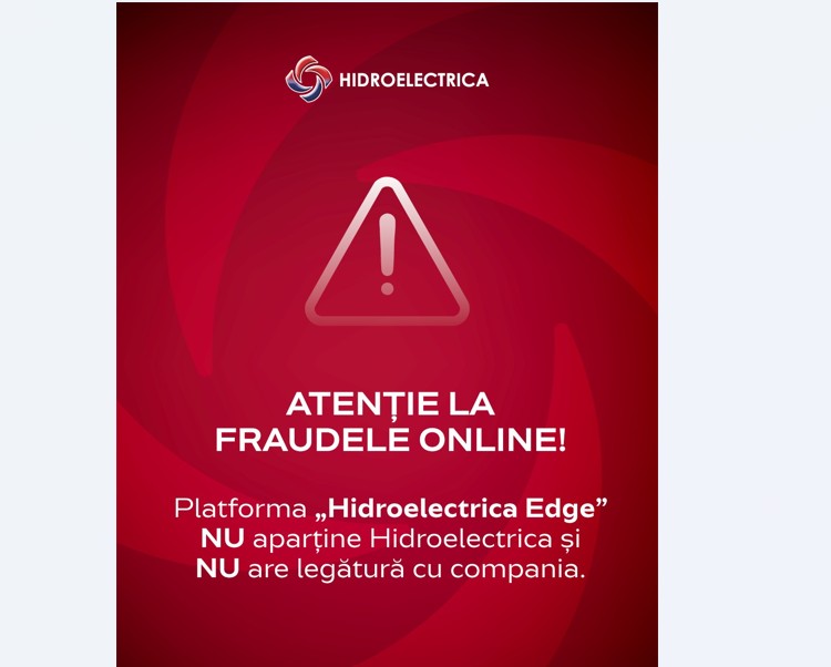„ATENȚIE LA FRAUDELE ONLINE! „Hidroelectrica Edge” NU are legătură cu Hidroelectrica. În ultimele zile au apărut în mediul online reclame și platforme care folosesc în mod fraudulos numele și imaginea Hidroelectrica pentru a promova presupuse „oportunități de investiții”, precum platforma numită „Hidroelectrica Edge”.