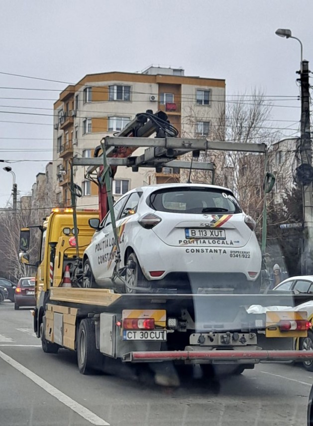 UPDATE Imagine virală surprinsă la Constanța! Mașină a Poliției Locale, ridicată din parcarea Primăriei